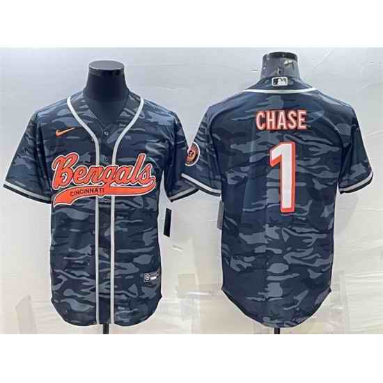 Men Cincinnati Bengals #1 Ja 27Marr Chase Grey Camo With Patch Cool Base Stitched Baseball Jersey