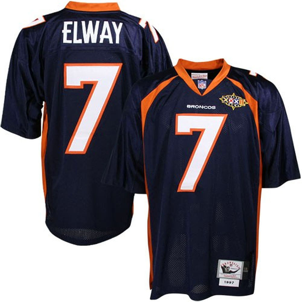 Men Mitchell Ness Denver Broncos #7 John Elway Blue 75th Patch Throwback NFL Jersey