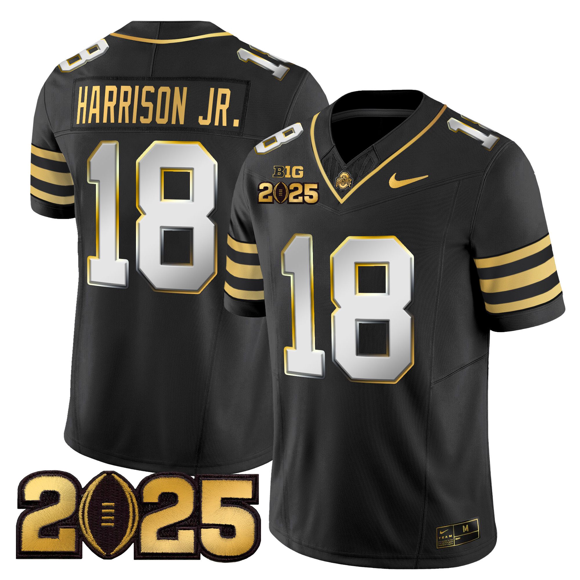 Men Ohio State Buckeyes #18 Harrison jr Black 2025 CFP Final Patch Gold Vapor Limited NCAA Jersey style 2