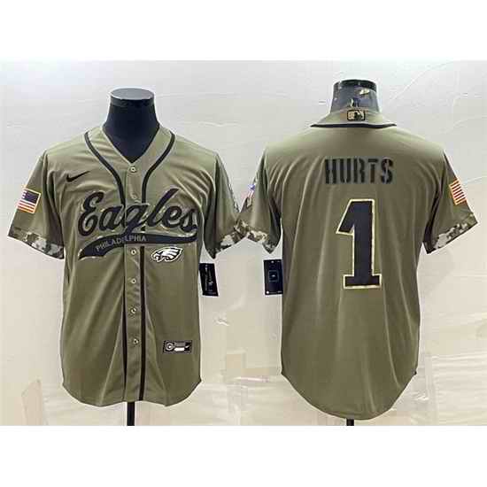 Men Philadelphia Eagles #1 Jalen Hurts Olive 2022 Salute To Service Cool Base Stitched Baseball Jersey