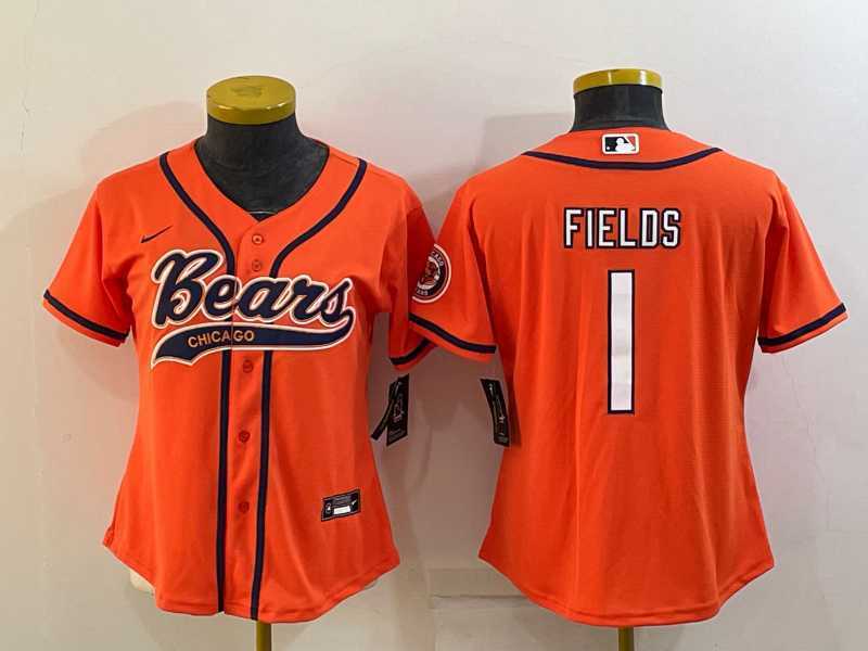 Women's Chicago Bears #1 Justin Fields Orange With Patch Cool Base Stitched Baseball Jersey