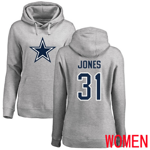 - Women Dallas Cowboys Ash Byron Jones Name and Number Logo #31 Pullover NFL Hoodie Sweatshirts