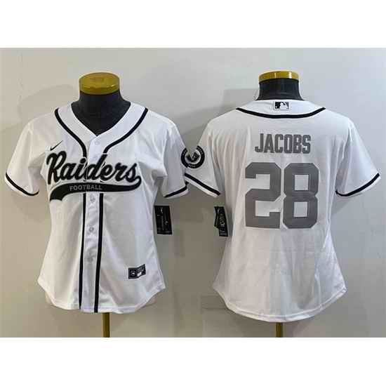Women Las Vegas Raiders #28 Josh Jacobs White Silver With Patch Cool Base Stitched Baseball Jersey