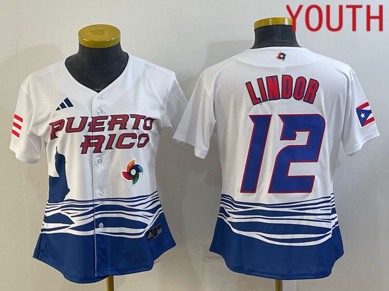 Youth 2023 World Cub Puerto Rico #12 Lindor White MLB Jersey2
