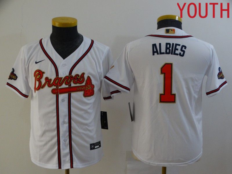 Youth Atlanta Braves #1 Albies White Gold Game Nike 2022 MLB Jersey