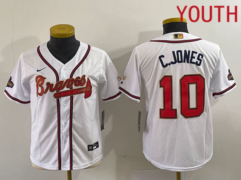 Youth Atlanta Braves #10 C.Jones White Gold Game Nike 2023 MLB Jersey