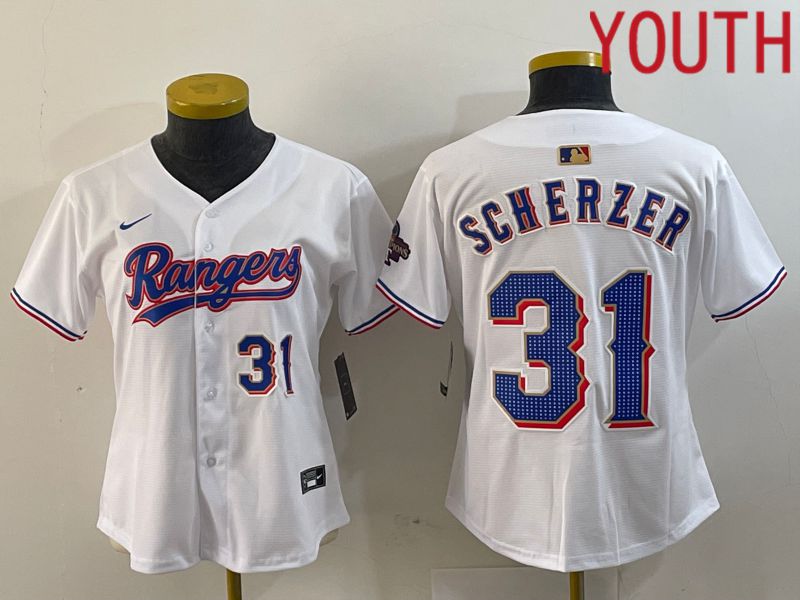 Youth Texas Rangers #31 Scherzer White Champion Game Nike 2024 MLB Jersey style 2
